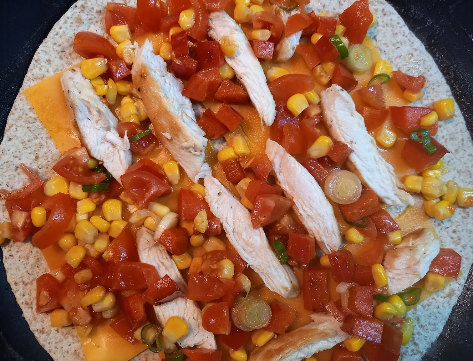 na čisté pánvi necháme rozehřát pidi kousek másla, pak položíme celozrnnou tortillu, poklademe plátky cheddaru, na to proužky hotového masa a volná místa mezi masem vyplníme připravenou zeleninovou směsí z kroku č. 2 (tedy směsí s kukuřicí)